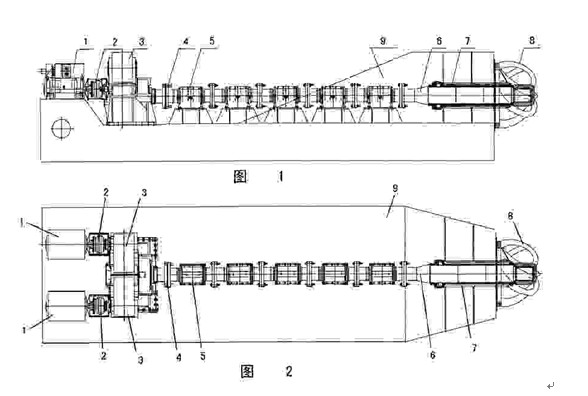該雙電機驅(qū)動絞刀傳動系統(tǒng)包含變頻電機1、高彈性摩擦離合器2、齒輪箱3、中間傳動軸4、中間支撐裝置5、絞刀軸6、絞刀支承軸承7和絞刀8。兩臺變頻電機1、兩個高彈性摩擦離合器2、兩個齒輪箱3分成兩組,均由橋架支承;每一組包括一臺變頻電機1、一個高彈性摩擦離合器2和一個齒輪箱3;高彈性摩擦離合器將變頻電機1和齒輪箱3連接起來,變頻電機1通過高彈性摩擦離合器2將功率和轉(zhuǎn)速傳送到齒輪箱3上。高彈性摩擦離合器2起到柔性連接作用。并通過離合器內(nèi)部橡膠件調(diào)節(jié)系統(tǒng)剛度,##系統(tǒng)具有良好扭振性能。兩齒輪箱3成雙機并車結(jié)構(gòu)共同驅(qū)動中間傳動軸4。齒輪箱3有可承受雙向推力的軸承,絞刀工作時產(chǎn)生的軸向推力通過中間傳動軸4傳遞到齒輪箱3的軸承上,##綜通過齒輪箱地腳鉸制螺栓傳遞到橋架9上。在兩臺變頻電機1同時工作時,可以對兩臺變頻電機1同時進行控制,從而能滿足兩臺變頻電機1均勻負載。齒輪箱3與中間傳動軸4聯(lián)接。中間傳動軸4與絞刀軸6聯(lián)接。每一中間傳動軸4均由一中間支承裝置5來支承。中間支承裝置5包括高分子復合材料軸承,中間傳動軸4可轉(zhuǎn)動地穿過高分子復合材料軸承。高分子復合材料軸承使用海水海水潤滑和冷卻,具有彈性好、耐磨性好的特點。中間支承裝置5通過地腳鉸制螺栓緊固在橋架9上,可以有效地起到支撐中間傳動軸4自身重量以及運轉(zhuǎn)產(chǎn)生的徑向力作用。絞刀支承軸承7是高分子復合材料軸承,對橋架9振動具有良好的減震和吸震作用,同時對于橋架9的不規(guī)則變形具有良好的位移補償能力。