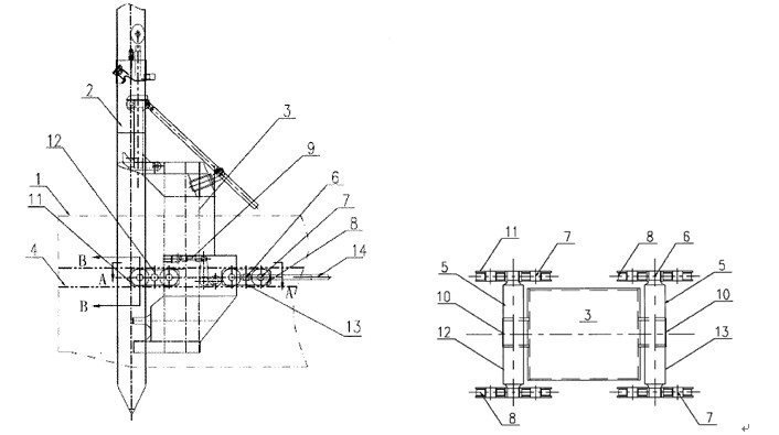 船體1、鋼樁2、臺(tái)車主體結(jié)構(gòu)3、軌道4、平衡梁5、墻架轉(zhuǎn)軸6、滾輪轉(zhuǎn)軸7、行走滾輪8、緩沖裝置9、平衡梁轉(zhuǎn)軸10、滾輪墻架11、##行走軛架12、第二行走軛架13、行走油缸14