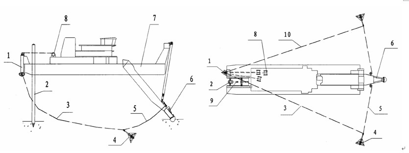 6--挖泥頭,7--挖泥船,8--絞車,9--臺(tái)車,10--左邊纜。