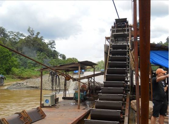 河沙中沙金富集一般是用淘金船或旱地淘金機,沙金富集系統(tǒng)目前常用的有固定淘金氈溜槽、鼓動式溜槽、擋邊皮帶式自動洗選機、淘金離心機等。