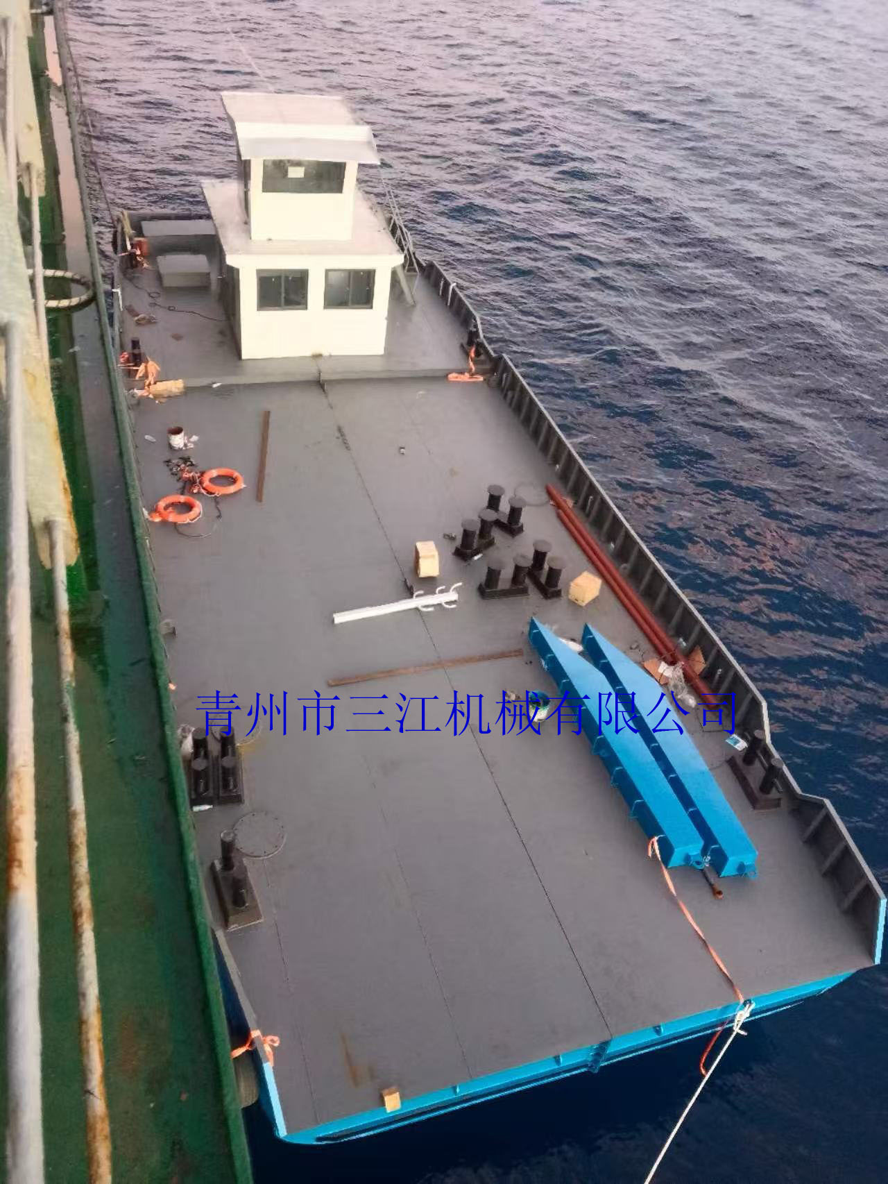 我們?cè)O(shè)計(jì)制造了兩艘130噸載重拼裝式接駁船,以及一座可拆解、可漂浮、可重復(fù)使用的拼裝式浮箱沉箱碼頭。為適應(yīng)母船吊裝能力,每一模塊重量均控制在30噸以內(nèi)。設(shè)備運(yùn)抵海域后,兩艘接駁船直接在海上拼裝完成;碼頭同樣由浮箱模塊在海上組裝,然后由接駁船拖至岸邊,打開海底閥完成沉箱作業(yè),穩(wěn)固地構(gòu)建了岸邊臨時(shí)卸載平臺(tái)。