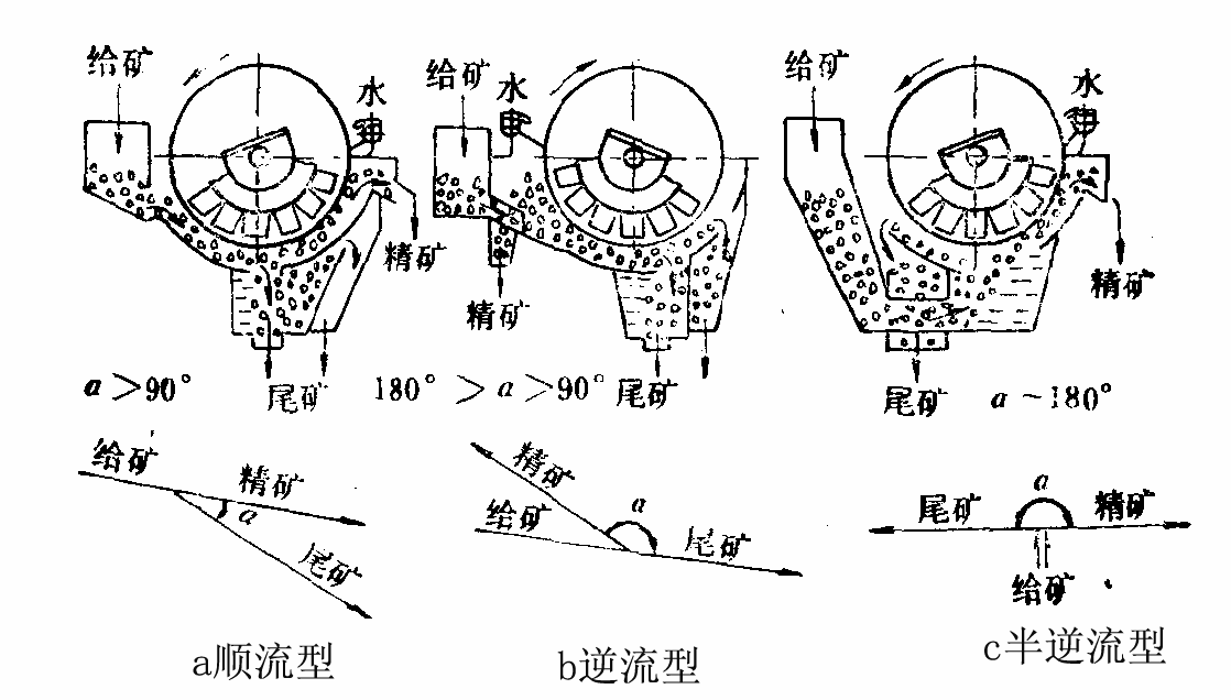 由于磁極的極性沿圓筒旋轉(zhuǎn)方向是交替排列的,并且在工作時(shí)固定不動,“磁團(tuán)”或“磁鏈”在隨圓筒旋轉(zhuǎn)時(shí),由于磁極交替而產(chǎn)生磁攪拌現(xiàn)象,被夾雜在“磁團(tuán)”或“磁鏈”中的脈石等非磁性礦物在翻動中脫落下來,##終被吸在圓筒表面的“磁團(tuán)”或“磁蓮”即是精礦。精礦隨圓筒轉(zhuǎn)到磁系邊緣磁力##弱處,在卸礦水管噴出的沖洗水流作用下被卸到精礦槽中,如果是全磁磁輥,卸礦是用刷輥進(jìn)行的。非磁性或弱磁性礦物被留在礦漿中隨礦漿排出槽外,即是尾礦。以下是下選式的幾種形式: