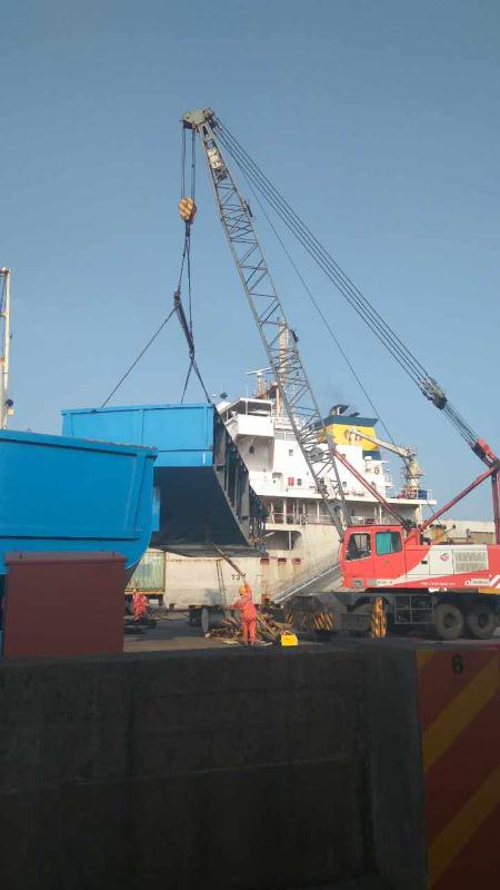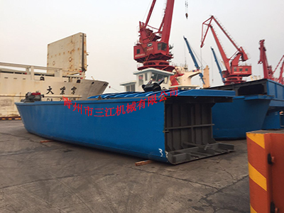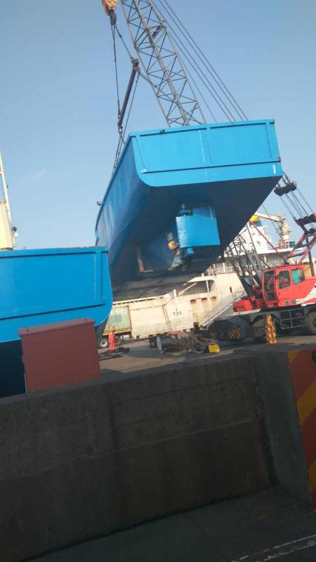 馬爾代夫客戶定做的帶跳板(通行甲板)300噸甲板駁船,從上海港裝散貨船,海運(yùn)至馬爾代夫馬累港后組裝。